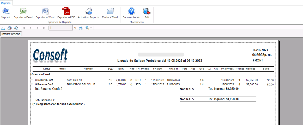 Este reporte muestra los check out que tendremos en la fecha que indiquemos. Este reporte al igual que el anterior, muestra la información al día en curso.