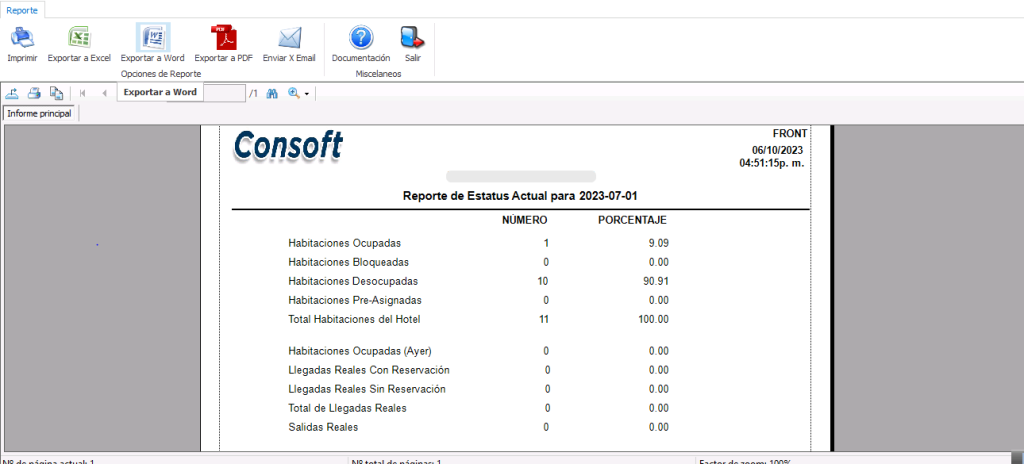 Este es un reporte bastante completo que contiene la información del hotel real, es decir, aquí veremos el cómo se cerró en cuánto a porcentaje de ocupación en cada concepto. Es importante imprimir o guardar este reporte ya que no se puede consultar de días anteriores