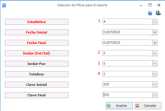 Clave inicial y final: Aquí encontramos los tipos de habitación existentes en el hotel y podemos filtrar el reporte por estas categorías para información más específica.
