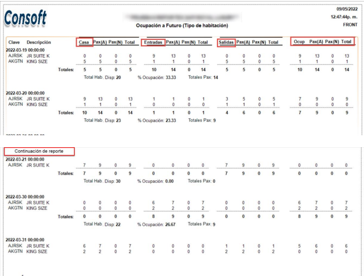Al generar este reporte, vemos la información organizada en 4 secciones, habitaciones en casa, entradas, salidas y totales y agrupadas por tipo de habitación (Figura 1.54).